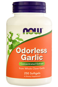 Now Foods Odourless Garlic From Whole Clove Garlic Now Foods Odourless Garlic is extracted from Allium sativum and is a specially made Japanese product. Garlic has been the subject of numerous studies in the past decade and has been endorsed by celebrities and athletes alike. Now Foods Odourless Garlic is aged 18 months and concentrated to yield high amounts of Scordinin, a unique sulfur compound which may be responsible for many of garlic's renowned benefits. Suggested use: As a dietary supplement, take 2 softgels 1 to 2 times daily, preferably with meals. Other ingredients: Rice bran oil, softgel capsule (gelatin, glycerin, water), yellow beeswax, silica and soy lecithin. Contains: Soy (lecithin) Contains no sugar, salt, starch, yeast, wheat, gluten, corn, milk, egg, shellfish or preservatives. Warnings: Store in a cool, dry place. If you are pregnant/lactating or taking any medications, please consult your healthcare practitioner prior to use.