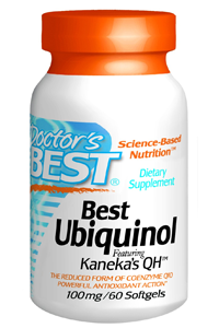 Doctor's Best Ubiquinol featuring Kaneka's QH Best Ubiquinol featuring Kaneka QH contains the reduced form of coenzyme Q10. Both ubiquinol (CoQ10-H2) and ubiquinone (CoQ10) are metabolically active, and are interchangeable in the body according to needs. Oral ubiquinol may offer improved bioavailability in individuals who have difficulty achieving high levels of this nutrient, such as aging adults or those concerned with nutrient absorption. Developed by Kaneka Corporation, the recognized leader in Co-enzyme Q10 for the past 30 years, KanekaQH is bringing the powerful benefits of CoQ10 to those whose ability to naturally produce this vital nutrient has been diminished. Suggested use: Take one softgel daily with food, or as directed by a nutritionally informed professional. Other ingredients: Rice bran oil, medium-chain triglycerides, beeswax, rosemary leaf extract, vitamin E (as d-alpha tocopherol), soy lecithin, gelatin, glycerin, annatto (color). Servings per container: 60 Contains nothing other than listed ingredients.