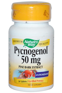 Pycnogenol Pine Bark Extract - by Nature's Way Certified Potency Pycnogenol is the name given to an extract made from the bark of the French Maritime Pine Tree. The extract contains a natural combination of procyanidins, bioflavonoids and organic acids, all of which are in constant proportion and offer an array of beneficial properties. Nature's Way Pycnogenol is a premium quality supplement, carefully tested and produced to certified quality standards. Suggested use: Take 1 tablet for each 50-60 pounds of body weight for the first week or two. Thereafter, adjust intake to 1 tablet for each 100-120 pounds of body weight. Other ingredients: Rosemary (leaf), cellulose, maltodextrin, modified cellulose gum, stearic acid, modified cellulose, silica, glycerin. Warnings: Freshness & safety sealed with printed outer shrinkwrap and printed inner seal. Do not use if either seal is broken or missing. Keep out of reach of children.