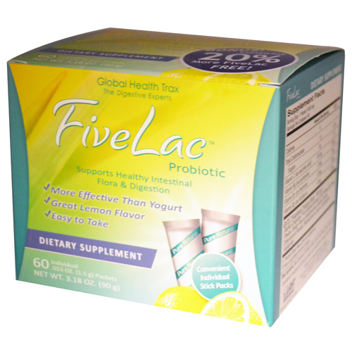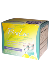 FiveLac Probiotic - from Global Health Trax Great Lemon Flavour What sets FiveLac apart from other probiotics is the technology used to keep the friendly bacteria alive. FiveLac gets live bacteria safely past the acids in the stomach and into your intestinal tract where it does its work. The strains of friendly bacteria in FiveLac were specifically chosen for their unique ability to survive the gastric juices in your stomach and remain alive once they reach your digestive tract. The secret to FiveLac's stable shelf life is its specialized manufacturing process which prevents moisture from reaching the product during production, and the packaging is designed to keep the moisture out. Refined dry yeast powder and fructo-oligosaccharides (FOS) are both included in FiveLac to help feed the friendly bacteria in the stick pack as well as help feed them once they reach your intestinal tract. Suggested use: Adults and children take one to two packets a day to start. Empty the packet contents into your mouth and follow with a few ounces of water, or add powder to a few ounces of water and drink. If additional support is desired, you may build gradually to a higher number of packets. Amount needed may vary from person to person. Packets may be taken any time of day, with or without meals. Other ingredients: Beta cyclodextrin, erythritol, lemon juice powder, silica, canola oil. Contains a maximum of 30 ppm casein (an ingredient derived from milk). Warnings: Keep out of reach of children. Do not use if packet is torn or damaged. Do not take while taking antibiotics. Pregnant or nursing mothers, if under medical care, or if you have a suppressed immune system, consult your health practitioner prior to use.